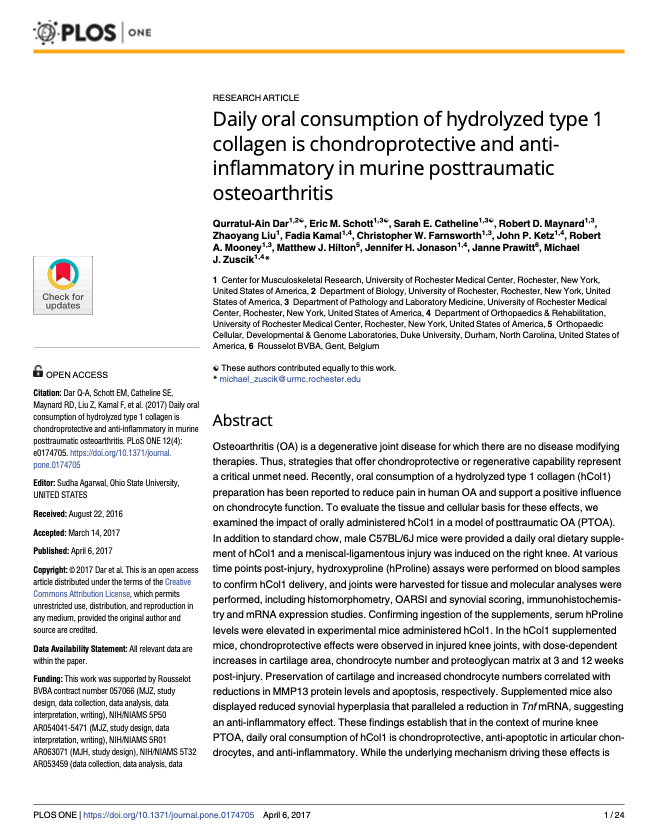 La consommation orale quotidienne de collagène hydrolysé de type 1 est chondroprotectrice et anti-inflammatoire dans l'ostéoarthrite post-traumatique chez la souris
